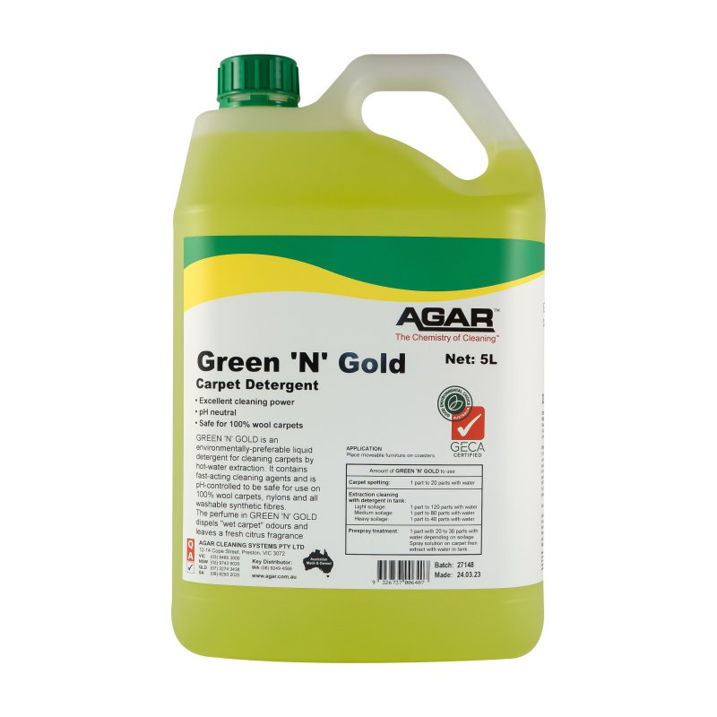 GreenNGold Carpet Detergent is an environmentally preferable detergent for cleaning carpets by hot water extraction. It contains fast-acting cleaning agents and is pH controlled to be safe to use on 100% wool carpets, nylons and all washable synthetic fibres.